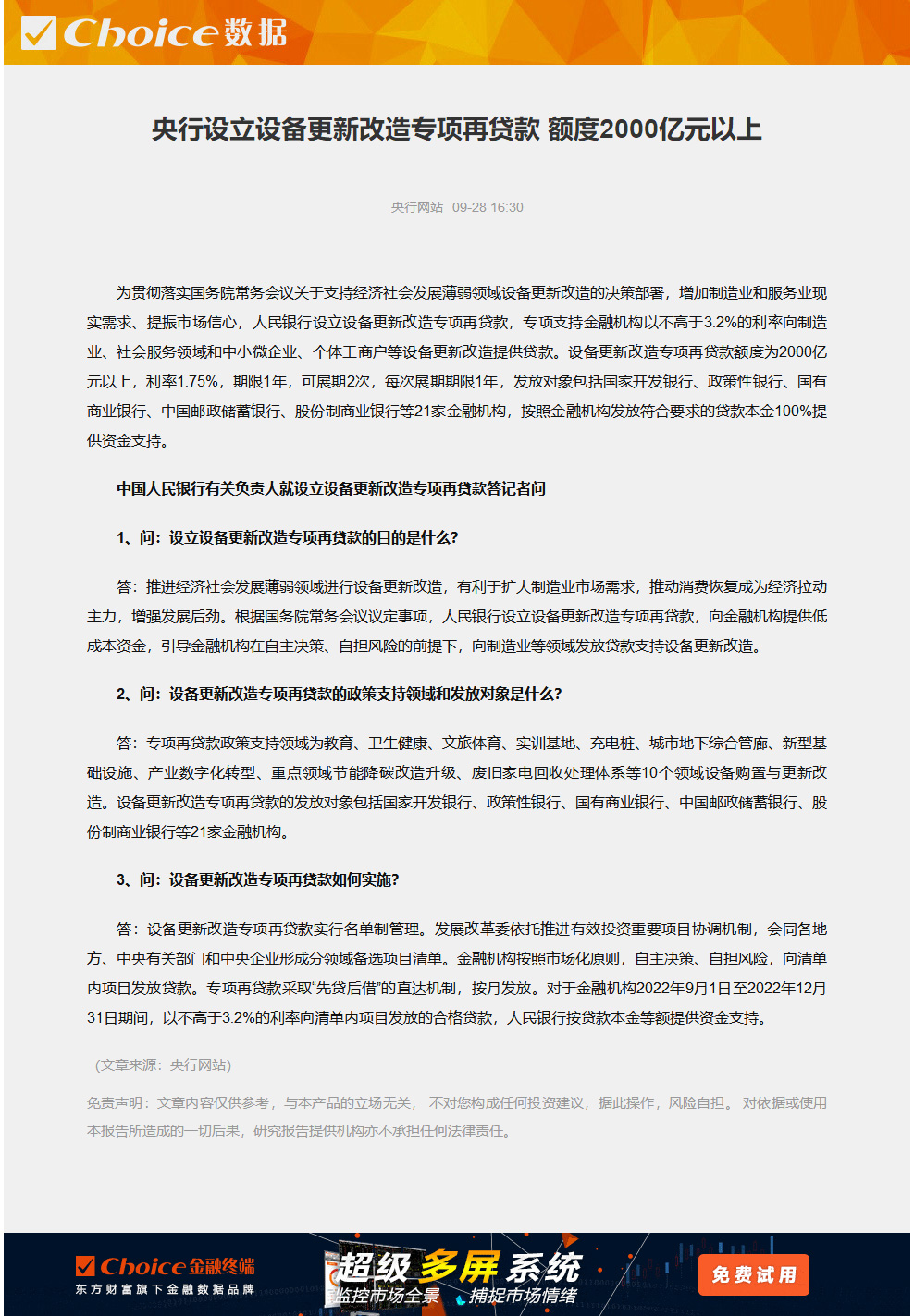 9月28日,根據(jù)中國人民銀行網(wǎng)站信息,為貫徹落實(shí)國務(wù)院常務(wù)會(huì)議關(guān)于支持經(jīng)濟(jì)社會(huì)發(fā)展薄弱領(lǐng)域設(shè)備更新改造的決策部署,增加制造業(yè)和服務(wù)業(yè)現(xiàn)實(shí)需求、提振市場(chǎng)信心,人民銀行設(shè)立設(shè)備更新改造專項(xiàng)再貸款,專項(xiàng)支持金融機(jī)構(gòu)以不高于3.2%的利率向制造業(yè)、社會(huì)服務(wù)領(lǐng)域和中小微企業(yè)、個(gè)體工商戶等設(shè)備更新改造提供貸款。設(shè)備更新改造專項(xiàng)再貸款額度為2000億元以上,利率1.75%,期限1年,可展期2次,每次展期期限1年,發(fā)放對(duì)象包括國家開發(fā)銀行、政策性銀行、國有商業(yè)銀行、中國郵政儲(chǔ)蓄銀行、股份制商業(yè)銀行等21家金融機(jī)構(gòu),按照金融機(jī)構(gòu)發(fā)放符合要求的貸款本金100%提供資金支持。