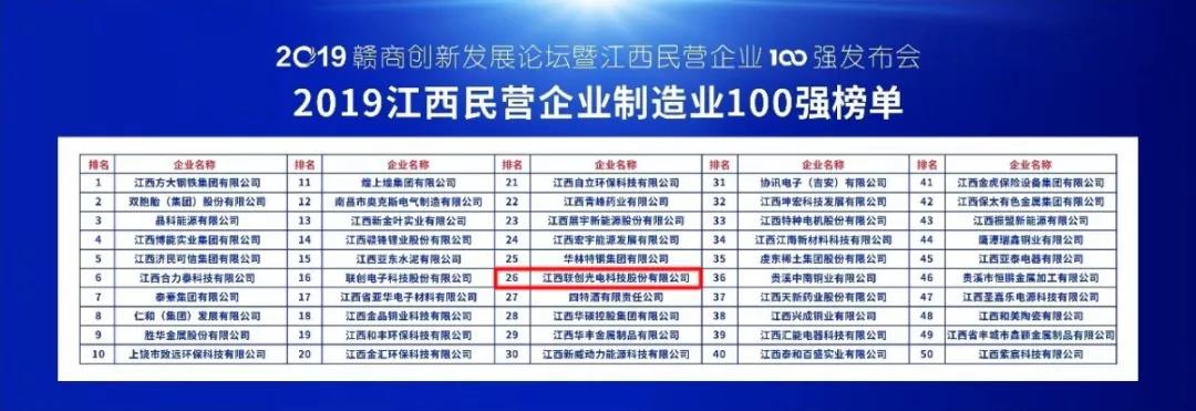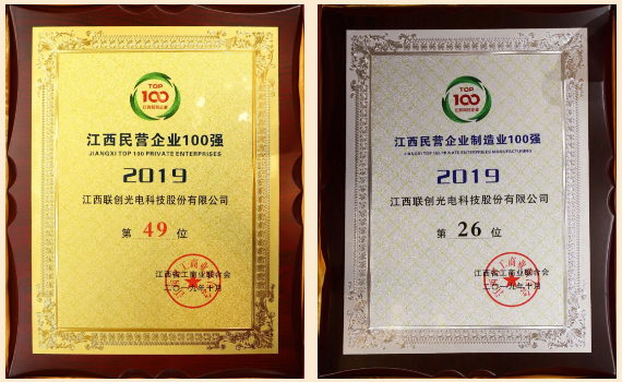 會上發(fā)布了2019江西民營企業(yè)100強、2019江西民營企業(yè)制造業(yè)100強名單,聯(lián)創(chuàng)光電均上榜,分別位列江西民營企業(yè)100強第49位、江西民營企業(yè)制造業(yè)100強第26位。聯(lián)創(chuàng)光電常務副總裁葉建青代表公司參會并領(lǐng)取獎牌。