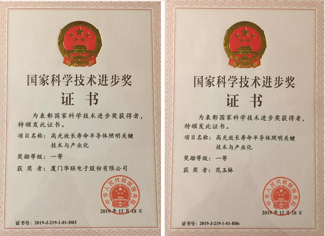 1月10日上午,2019年度國家科學(xué)技術(shù)獎勵大會在北京人民大會堂隆重舉行,會上共公布國家科學(xué)技術(shù)進步獎185項。廈門華聯(lián)電子股份有限公司作為第三序列完成單位與中國科學(xué)院半導(dǎo)體研究所、三安光電股份有限公司、國家半導(dǎo)體照明工程研發(fā)及產(chǎn)業(yè)聯(lián)盟、廈門光莆電子股份有限公司等多家單位聯(lián)袂參與的“高光效長壽命半導(dǎo)體照明關(guān)鍵技術(shù)與產(chǎn)業(yè)化”項目榮獲國家科學(xué)技術(shù)進步獎一等獎,華聯(lián)電子榮譽董事長范玉缽作為獲獎項目主要完成人之一同時接受表彰。